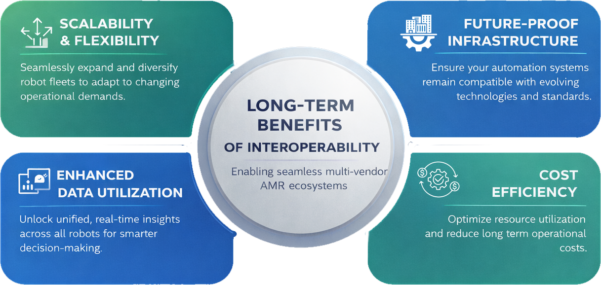 Long-term interoperability in Autonomous Mobile Robots (AMRs) provides sustained operational efficiency, allowing heterogeneous fleets from different vendors to work together. The key long-term benefits of interoperability include: